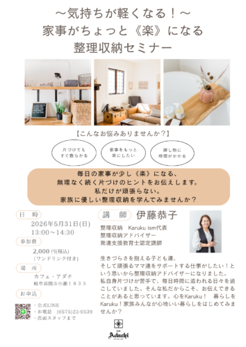 整理収納アドバイザーの伊藤さんを講師にお迎えし、整理収納を学ぶセミナーを開催します。
